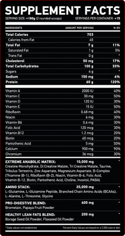 Elite Protein Blend (Hydrolyzed Whey Protein Isolate, Whey Protein Concentrate, Calcium Caseinate, Egg Albumen), Maltodextrin, Extreme Anabolic Matrix (Creatine Monohydrate, Di Creatine Malate, Tri Creatine Malate, Taurine, Tribulus Terrestris, Zinc Aspartate, Magnesium Aspartate, B-Complex), Amino Stack: (L-Glutamine, L-Glutamine Peptide, Branched Chain Amino Acids, L-Alanine, L-Threonine, Glycine), Pro-Digestive Blend: (Bromelain, Papaya Fruit Powder), Healthy Lean Fats Blend (Borage Seed Oil Powder, Flaxseed Oil Powder), Vitamin & Mineral Blend (Calcium Lactate, Potassium Citrate, Sodium Citrate, Magnesium Oxide, Ascorbic Acid, DL-Alpha Tocopheryl Acetate, Vitamin A Palmitate, Calcium Sulfate, Zinc Oxide, Dl-Alpha Tocopherols, Manganese Sulfate, Beta Carotene, Tri-Calcium Phosphate, Phytonadione, Cholecalciferol), Sucralose, Stevia, Natural and Artificial Flavors.